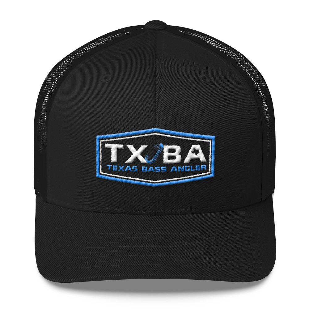 The TXBA (Texas Bass Angler) snapback trucker Texas fishing hat features three weedless hooks in the center of the design with an aqua accent trim. Represent your home state (or the state you love to fish in) and wear a Texas fishing hat this season.